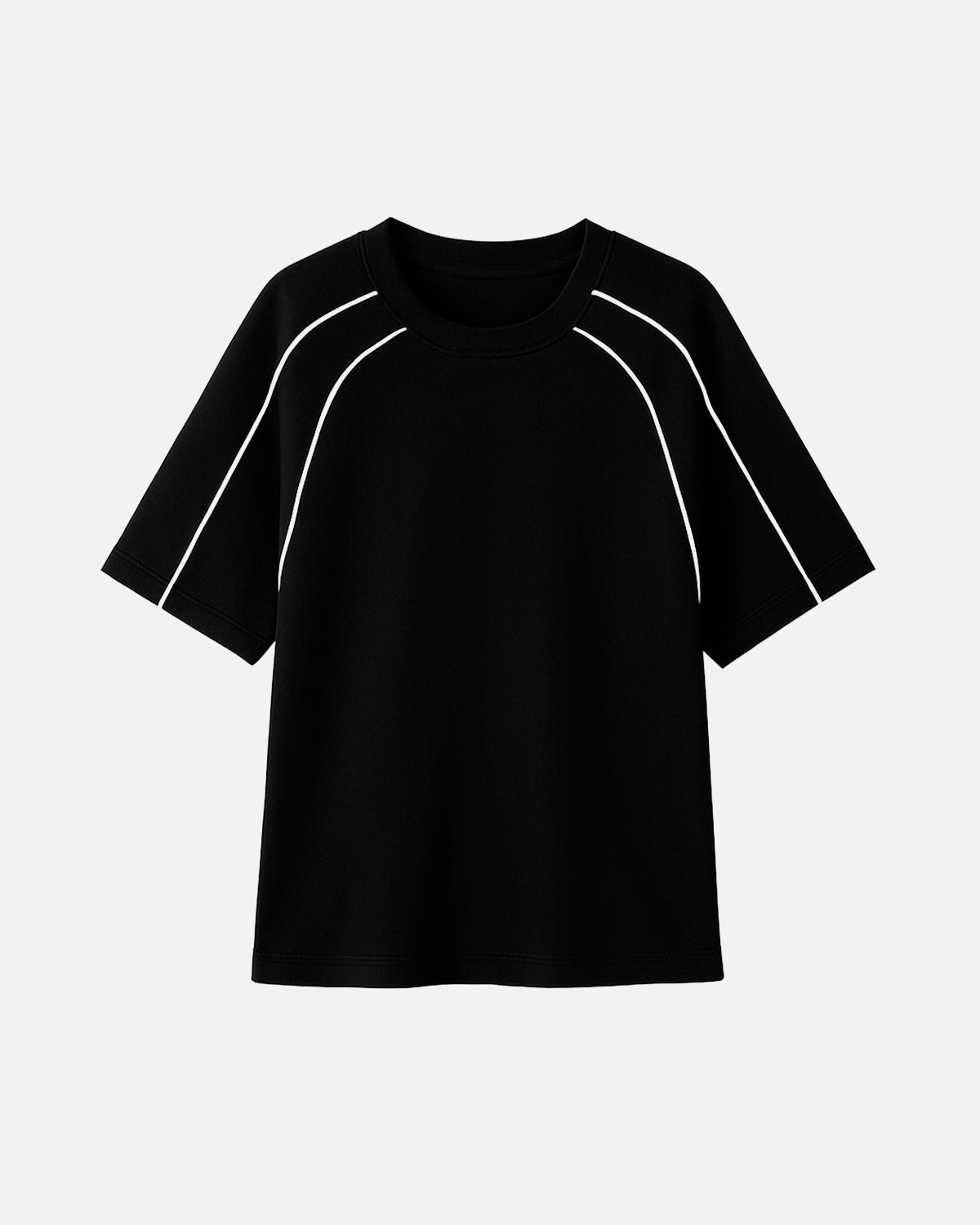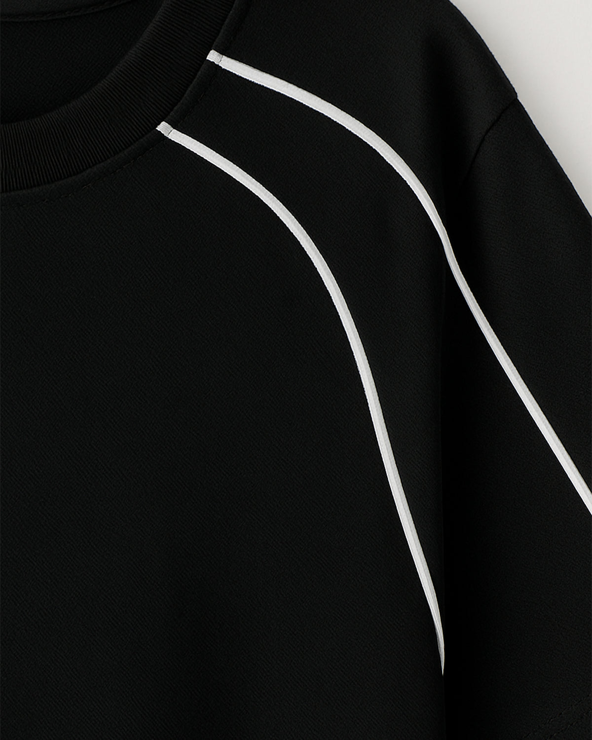 Diseño Oversize con Detalles Visuales: Las líneas blancas sobre fondo negro aportan dinamismo visual y carácter sin perder la esencia minimalista.